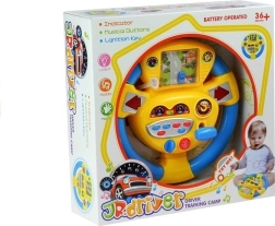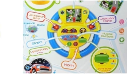 Questo volante interattivo per bambini offre tante funzioni che sviluppano abilità e sensi in modo divertente. Ruotando il volante la macchinina sullo schermo si muove sulla strada, si accendono gli indicatori e, premendo i pulsanti, si attivano il clacson e vari effetti sonori. Grazie alla vivace combinazione giallo–turchese, il giocattolo è molto attraente per i bambini.