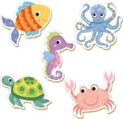 Assembla il pesciolino, il polpo, il cavalluccio, la tartaruga e il granchio: ogni immagine ha un numero diverso di pezzi, così i bambini passano naturalmente dai puzzle più semplici a quelli più complessi. I pezzi sono robusti, si impugnano bene e, grazie ai colori e alle forme vivaci, invitano al gioco.