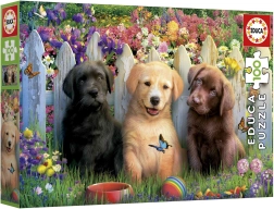 Tre cuccioli giocherelloni in un giardino colorato con fiori e farfalle attirano l’attenzione e motivano alla composizione.