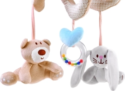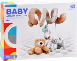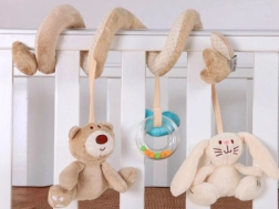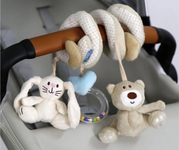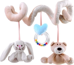 La spirale in peluche comprende tre giocattoli appesi che supportano lo sviluppo sensoriale: un orsacchiotto, un coniglio e un anello con perline.