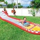 Goditi al massimo il divertimento estivo con questa grande pista da corsa gonfiabile con scivolo e due materassini in stile auto da corsa. Ogni materassino ha maniglie robuste per una presa sicura, la superficie di scivolamento può essere inumidita collegando un tubo da giardino e l’intero set ha una portata di 100 kg. Nella confezione trovi anche una toppa di riparazione. Adatto per bambini dai 6 anni.
