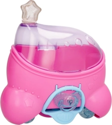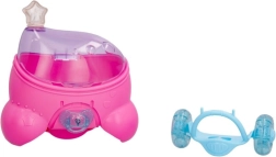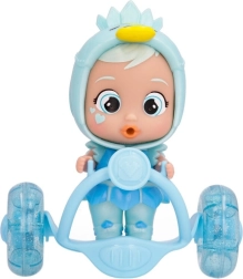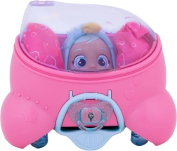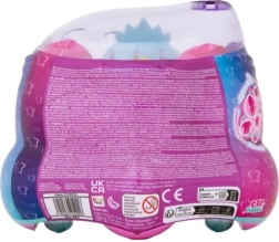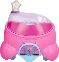 La bambola Cry Babies Magic Tears Sydney è vestita con un outfit futuristico con dettagli scintillanti, in una casetta modellata a forma di stella. Questa casetta non solo protegge la bambola, ma una volta rimossi i cerchi rosa si trasforma in un segway su cui Sydney può guidare.