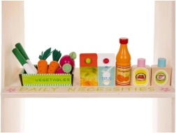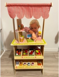 Regala ai bambini il loro mercato! Una elegante bancarella in legno con tetto a strisce, mensole e sezioni dedicate a frutta e beni di prima necessità stimola fantasia, comunicazione e motricità fine. Gli accessori realistici – cassa con scanner, carta di pagamento, bilancia e lavagna/“orologio” girevole – trasformano ogni spesa in un’avvincente avventura.