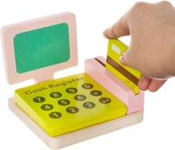Cassa con scanner, bilancia, lavagna girevole e tanti alimenti in legno: tutto ciò di cui i bambini hanno bisogno per aprire il proprio negozio ed esercitare le abilità sociali.