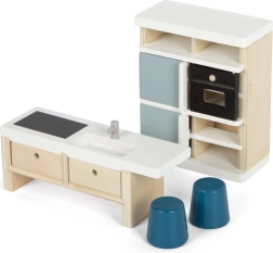 Questo bellissimo set da cucina per la casa delle bambole offre un'esperienza di gioco realistica. È composto da un armadio da cucina alto, un'isola con lavello e piano cottura, e un tavolo da pranzo con due panche e sgabelli. L'armadio della cucina include un frigo combinato con freezer e un forno con sportelli apribili.