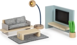 Questo set di mobili splendidamente realizzato porta elementi realistici nei giochi per bambini che aiutano a sviluppare il mondo immaginario dei piccoli architetti e designer. I bambini possono essere coinvolti nel gioco grazie alla possibilità di cambiare il "programma televisivo" tramite le schede intercambiabili, mentre la lampada da terra aggiunge una vera atmosfera al soggiorno.