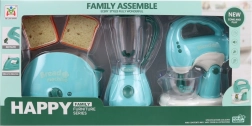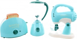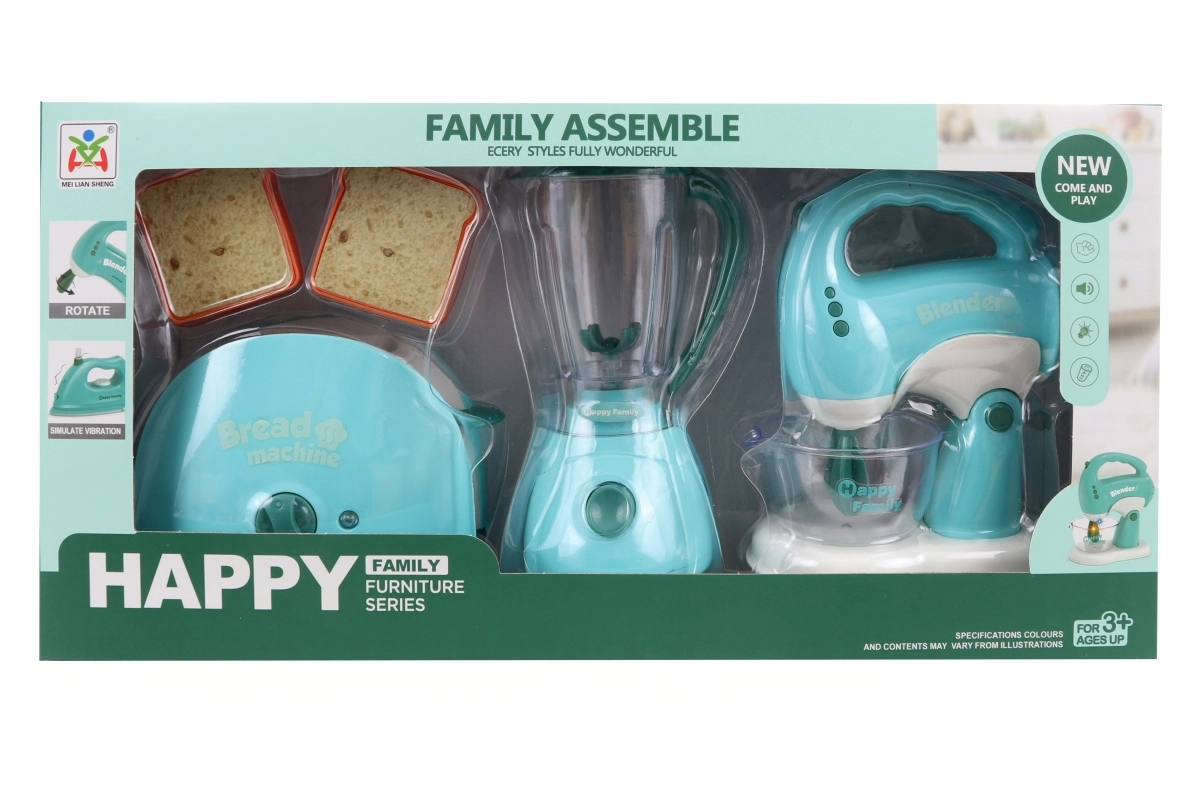 Questo set di elettrodomestici da cucina include tostapane, frullatore e sbattitore. Ogni apparecchio è alimentato da 2 batterie AA, non incluse nella confezione. Dopo l’inserimento delle batterie il tostapane si illumina ed emette suoni, il frullatore ruota ed emette suoni, lo sbattitore si illumina, emette suoni e le fruste ruotano. Materiale: plastica. Confezionato in scatola. Dimensioni confezione ca. 43×22×9,5 cm. Età 3+.
