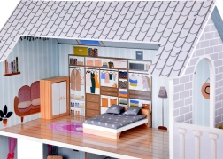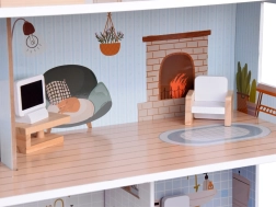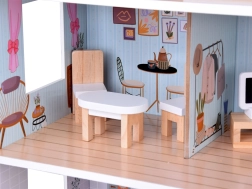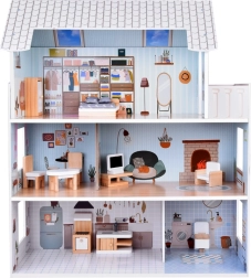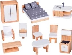 La confezione include un ricco set di mobili, grazie al quale è facile allestire le varie stanze. La struttura in legno resistente, i bordi lisci e i materiali atossici garantiscono un gioco sicuro. Il montaggio è rapido e intuitivo: i pezzi sono numerati e il manuale illustrato guida passo dopo passo.