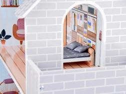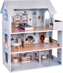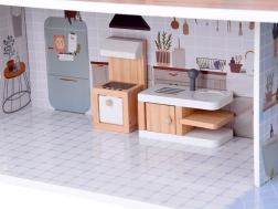 Questa elegante villa in legno per bambole offre tre piani di divertimento e tanto spazio alla fantasia. I bambini scopriranno cucina, bagno, soggiorno, sala da pranzo e un'ampia camera da letto con balcone. Carte da parati, pavimenti e piccole decorazioni in colori pastello creano un'atmosfera accogliente per storie senza fine.