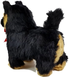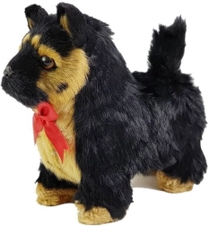 Il manto nero‑marrone, gli occhi scuri e il fiocco rosso conferiscono al giocattolo un aspetto fedele e garantiscono la massima morbidezza al tatto.