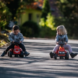 Nel set sono inclusi anche rastrello e paletta per giocare in giardino. Il bambino può scegliere l'aspetto del trattore grazie a due set di adesivi – faccina allegra o stile classico. Il clacson nel volante farà felice ogni piccolo guidatore.