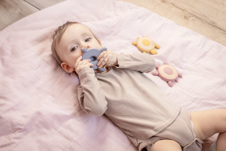 Scopri il mordicchietto in legno e silicone a forma di tartaruga Grigio Colomba, ideale per il sollievo dalle gengive doloranti e lo sviluppo sensoriale del tuo bambino.