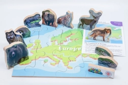 Scopri le bellezze d'Europa con questo set educativo di puzzle in legno, che include 16 pezzi della mappa del continente e 10 animali raffigurati realisticamente.