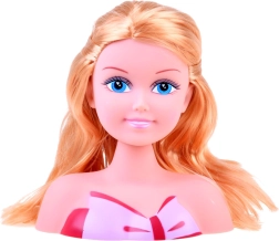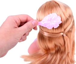Elegante testina per acconciature con lunghi capelli biondi e accessori per la creazione di acconciature che probabilmente piaceranno a ogni piccola parrucchiera. La modella ha lunghi capelli biondi e per il suo styling ci sono due ciocche colorate in viola e rosso. Fermagli, perline intrecciabili decoreranno ogni acconciatura creata dalla piccola stilista.
