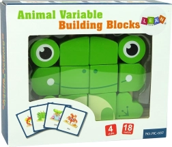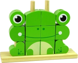 Il puzzle creativo in legno a forma di rana è progettato per incoraggiare i bambini a creare e imparare la coordinazione. Il puzzle include 12 pezzi che si montano su una base con pioli, permettendo di creare diversi animali o oggetti secondo la fantasia.