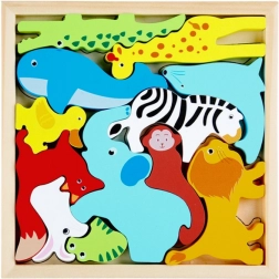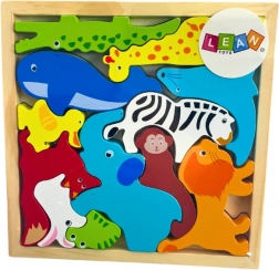 Questo colorato puzzle in legno porta ai bambini la gioia di scoprire il mondo degli animali. L’obiettivo è abbinare correttamente i singoli pezzi degli animali alla base: ogni pezzo ha una forma diversa, così i bambini esercitano la percezione delle forme e la pazienza. Il set include 12 animali, ad esempio leone, zebra, scimmietta e orca.