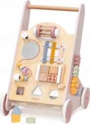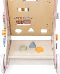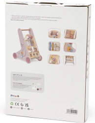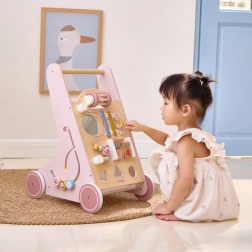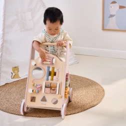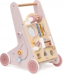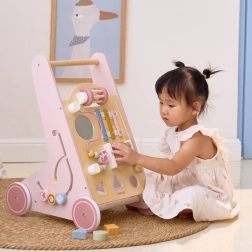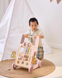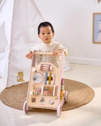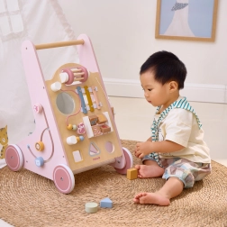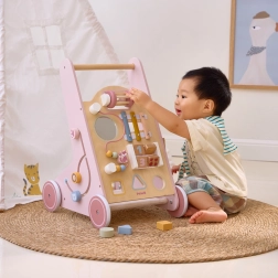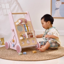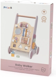 Presentiamo il deambulatore in legno per bambini PolarB in colore rosa, progettato per bambini dai 18 mesi. Combina attività divertenti come osservare nello specchio, blocchi rotanti, perline luccicanti, smistamento di forme e suonare lo xilofono. Con questo deambulatore, i tuoi figli esploreranno il mondo circostante in sicurezza.