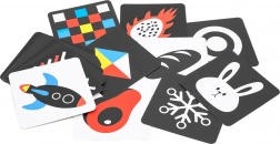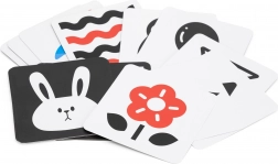 Una serie di carte in bianco e nero e in rosso e bianco con forme e immagini semplici attira naturalmente lo sguardo del bambino. Favorisce la fissazione, il tracciamento degli oggetti e la precoce percezione visiva – ideale per neonati e lattanti più piccoli.