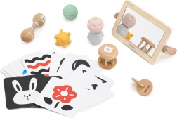 Set sensoriale completo per i più piccoli da 0–6 mesi che stimola vista, udito e tatto grazie a una combinazione studiata di strumenti. All'interno trovi carte ad alto contrasto, specchietto in legno, sonagli e palline tattili realizzati con materiali di qualità, incluso legno certificato FSC. Il set è pronto all’uso e perfetto anche come regalo.