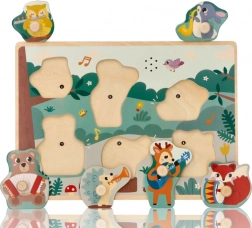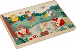 Questo puzzle sonoro in legno a tema bosco offre ai bambini un primo incontro con gli strumenti musicali in modo ludico. Ogni tassello colorato con animaletto ha una pratica manopola per una presa facile e, una volta inserito nel posto giusto, riproduce il relativo suono, incentivando a giocare e scoprire ancora e ancora.