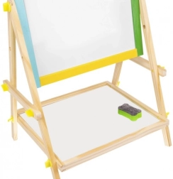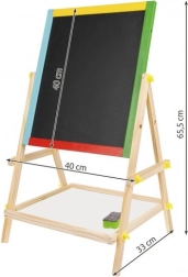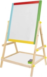 La stabile struttura in legno con elementi colorati è resistente e sicura per i bambini. La pratica mensola per accessori tiene gessetti, pennarello e spugnetta sempre a portata di mano. Il montaggio semplice senza attrezzi speciali piacerà a ogni genitore e le dimensioni compatte si adattano alla cameretta o all’area giochi.