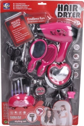 Elegante set cosmetico per piccole amanti della bellezza, contiene tutto il necessario per giocare al parrucchiere e al trucco. Include un phon da 14 cm, un pettine, forbici, specchietto manuale e da tavolo e un set di pennelli. Il phon funziona con 2× batterie AAA (non incluse).