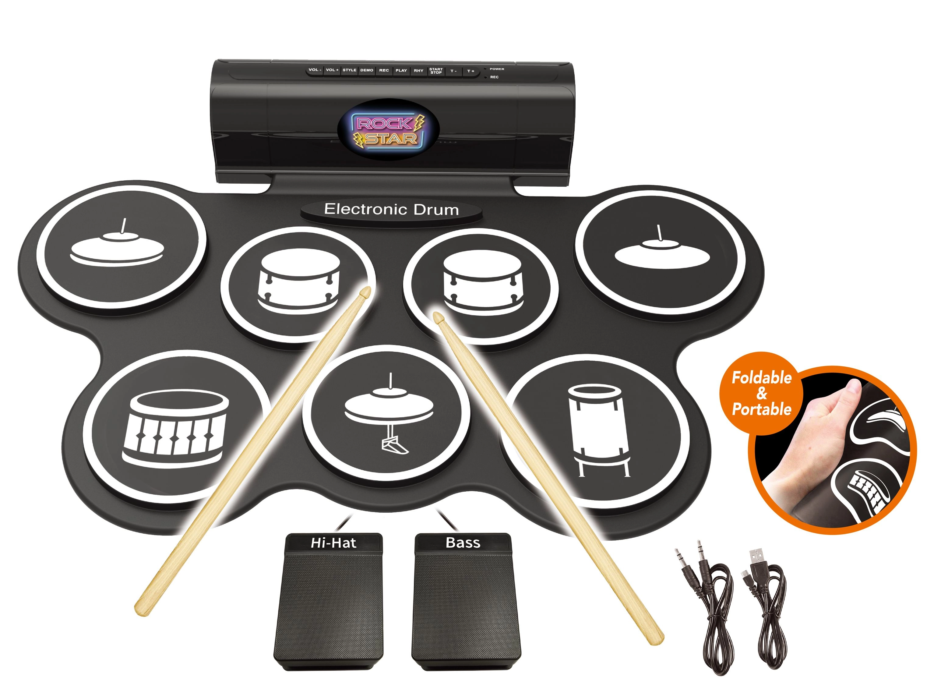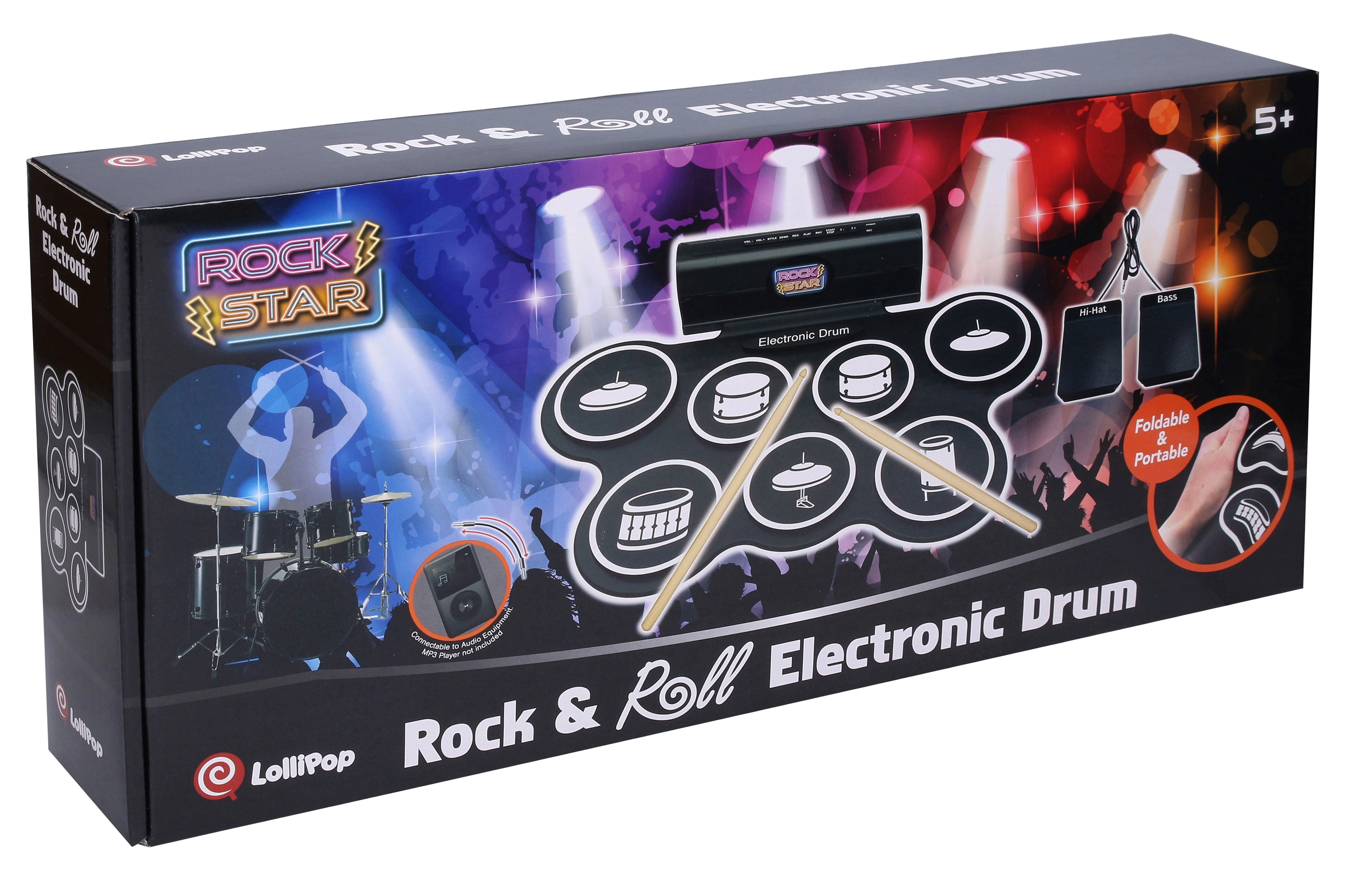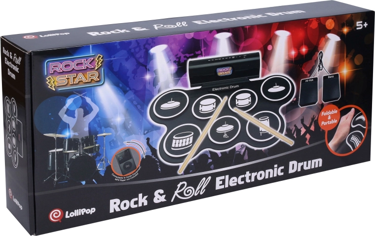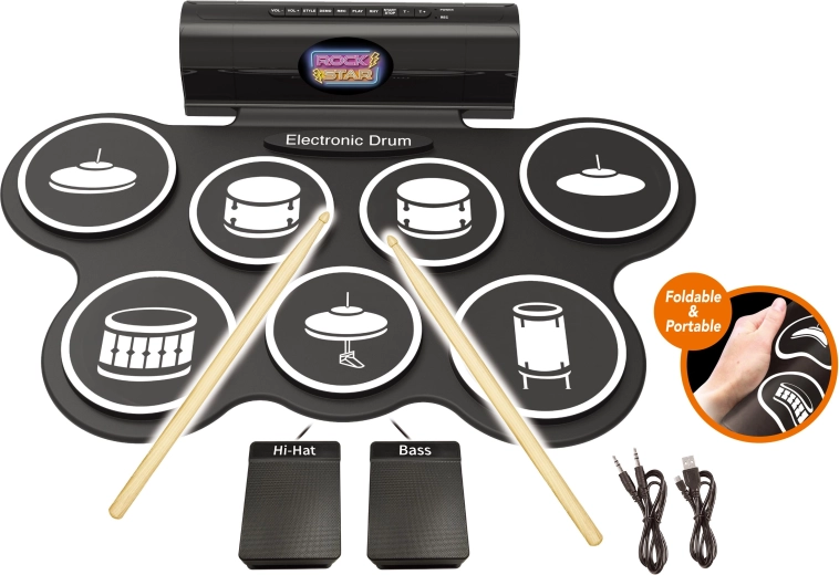 Compatto set di batteria elettronica per uso domestico e principianti, offre 7 suoni realistici, 2 pedali (hi-hat e cassa), effetti luminosi e sonori e la possibilità di registrazione e riproduzione. Inclusi nella confezione 3× batterie AA, cavo USB e cavo per smartphone/mp3.