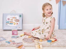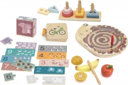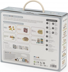 La confezione include il labirinto magnetico del riccio, costruzioni e puzzle, un set di frutta da tagliare e un libricino in legno con mezzi di trasporto. Il tutto è riposto in una pratica scatola con manico per un facile trasporto. Scelta ideale per piccoli esploratori pronti a attività più avanzate.