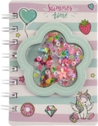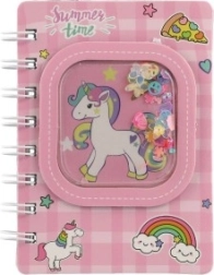 La copertina con finestrella trasparente piena di coriandoli e stelline colpisce al primo sguardo e dona al taccuino un look unico, amato da bambini e adulti.