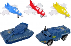 Tre caccia colorati, un carro armato cingolato e un veicolo blindato con carrozzeria in metallo portano l’azione sul mare e sulla terraferma.