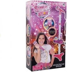 Trasforma i concerti di casa con questo set rosa per piccoli cantanti. Offre un pannello interattivo con altoparlante, disco proiettore con luci colorate, 10 basi musicali, pulsanti per applausi ed effetti del pubblico e collegamento MP3/telefono per cantare sulle canzoni preferite. Il treppiede regolabile in altezza cresce con il bambino e favorisce sviluppo musicale, senso del ritmo e coordinazione.