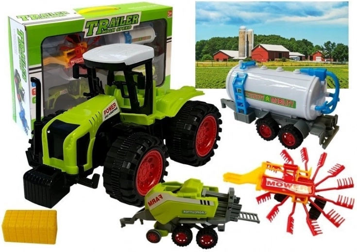 Set di veicoli agricoli con trattore, cisterna, rastrellatore di fieno e pressa