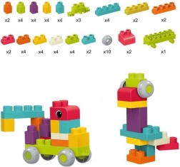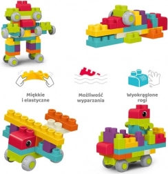 Costruzioni morbide e sicure per i più piccoli dai 6 mesi. Il set comprende 62 pezzi, inclusi 10 ruote per costruire piccoli veicoli. Materiale morbido, angoli arrotondati e possibilità di bollitura per l'igiene favoriscono lo sviluppo della motricità, la creatività e la percezione spaziale.