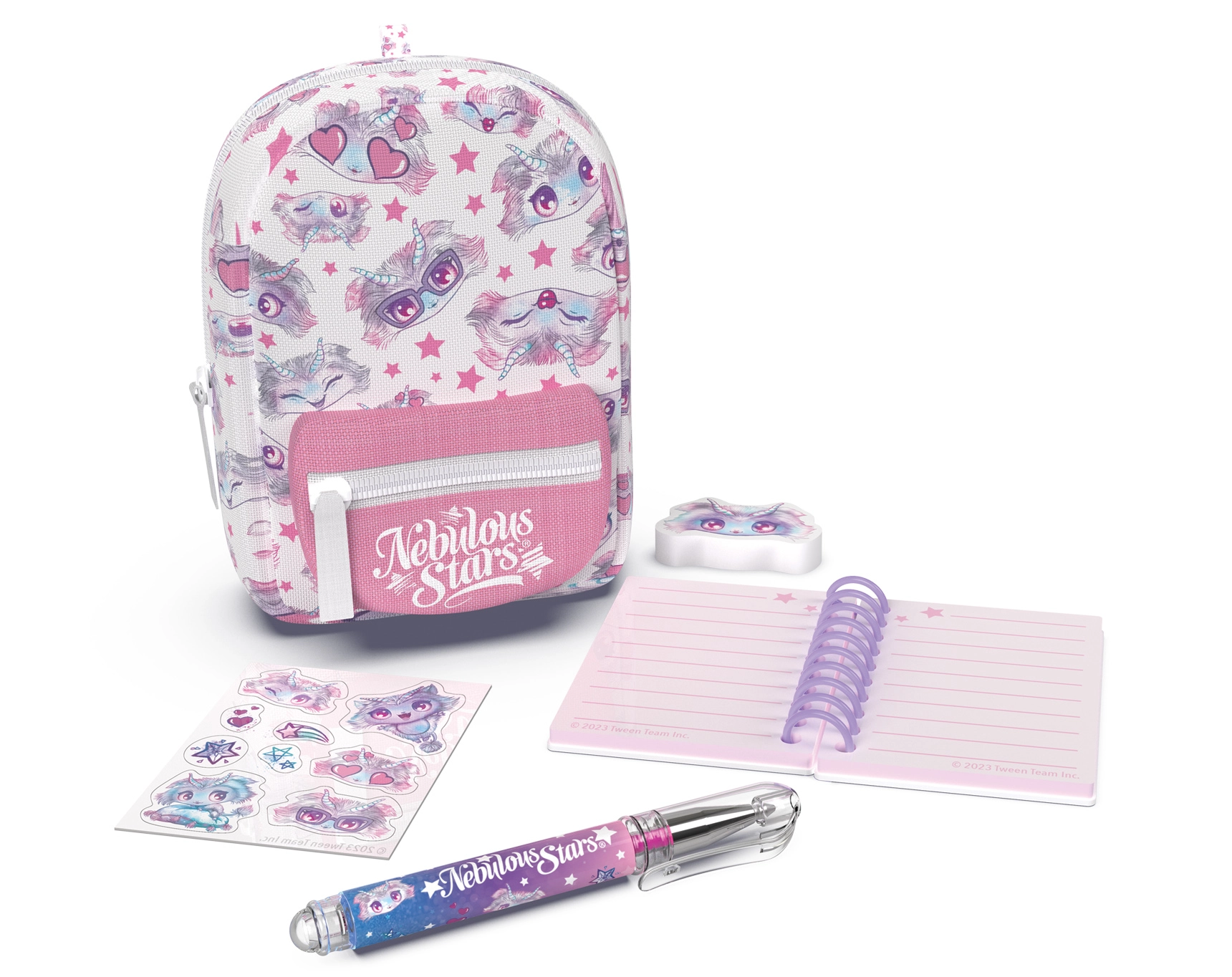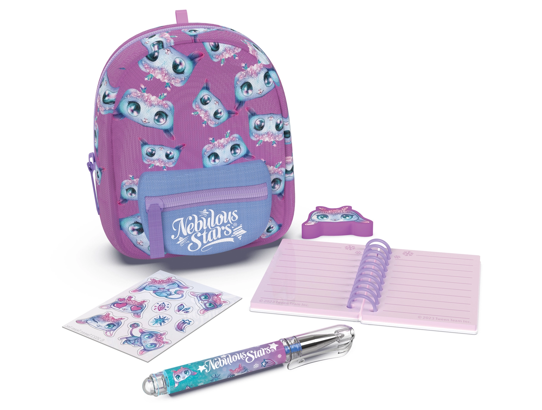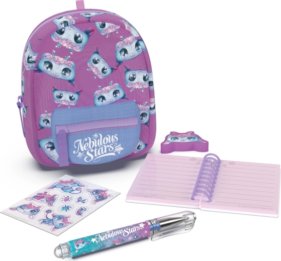 Elegante mini zainetto NEBULOUS STARS con set di cartoleria, ideale per i piccoli amanti della creatività anche in viaggio. Nelle dimensioni compatte 9 × 6 × 11 cm racchiude tutto il necessario: taccuino a righe, penna, gomma, adesivi e un grazioso portachiavi. Disponibile in 3 varianti di colore – blu, bianco e viola.