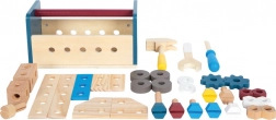 Martello, chiave e cacciavite in legno sono accompagnati da viti, dadi e elementi perforati – tutto il necessario per allenare la motricità fine e la fantasia.