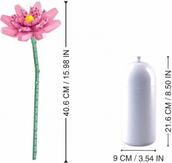 Il set è completamente compatibile con altri marchi, quindi potrai ampliarlo facilmente con le tue idee. Nella confezione trovi un manuale di montaggio dettagliato che ti guida passo dopo passo. Il loto assemblato raggiunge un'altezza di circa 40,6 cm, mentre il vaso misura 21,6 cm in altezza e 9 × 9 cm di diametro.