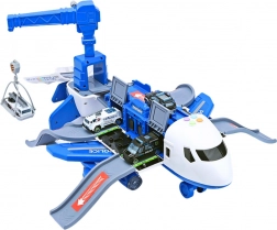 Una volta aperto, l’aereo si trasforma in una stazione di polizia mobile con rampe, vani portaoggetti e una piattaforma per “lanciare” le macchinine per interventi rapidi. Inclusi 3 veicoli della polizia, una gru girevole a 360° con rotella di comando e un set di segnali, coni e altri accessori per costruire la propria città e le strade.