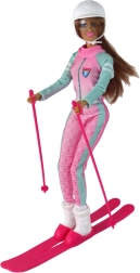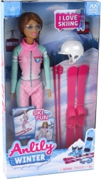 Bambola Anlily è una pupazzina splendidamente decorata che ricorda una vera sciatrice. Ha lunghi capelli castani e indossa un casco bianco per sciare in sicurezza, completato da eleganti occhiali colorati. È vestita con una tuta da sci rosa con dettagli verdi a contrasto e scarponi bianchi che si abbinano perfettamente al suo set.