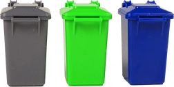 La confezione include tre secchi di plastica colorati che aiutano nell'apprendimento della separazione dei diversi tipi di rifiuti.