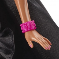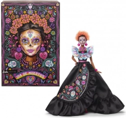 Con questa bambola unica Barbie dell'edizione Dia de Muertos 2024 puoi portare l'atmosfera di questa straordinaria festa direttamente a casa tua. La bambola indossa un abito sofisticato che combina una gonna satinata nera con un corpetto arricciato e una cintura in raso rosa-lilla. Questi abiti sono decorati con ricami ricchi di motivi ossei, floreali e teschi di zucchero.