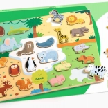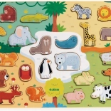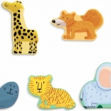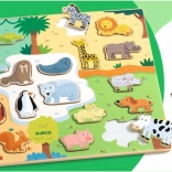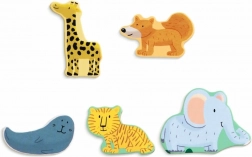 La tavoletta di legno assicura che ogni animale rimanga al suo posto, contribuendo a una migliore presa e manipolazione. Ogni pezzo può servire al bambino anche come pedina di gioco, aumentando il potenziale creativo di questo giocattolo.