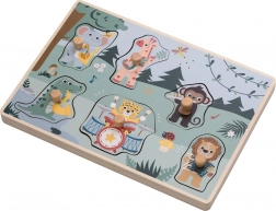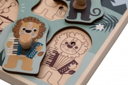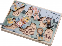 Scoprite il mondo della giungla con una sicura tavola a incastri in legno che, dopo l’inserimento del pezzo giusto, riproduce i versi dei singoli animali. I bambini esercitano in modo giocoso il riconoscimento delle forme e imparano ad associare immagini e suoni.