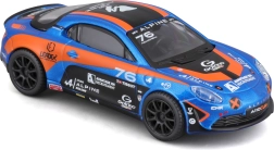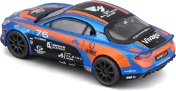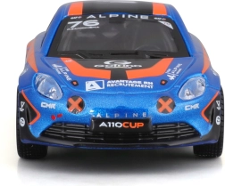 Modello dettagliato dell’auto da corsa Alpine A110 Cup con l’iconica livrea blu‑arancione, proporzioni realistiche, stampe pulite degli sponsor e ruote liberamente rotanti per uno scorrimento fluido. Vetri oscurati, fari sagomati e silhouette aerodinamica enfatizzano il carattere sportivo dell’originale.