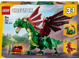 Con il set LEGO Creator 3 in 1 Drago Medievale, i bambini entrano facilmente nel mondo di cavalieri, castelli e creature mitiche. Il modello principale presenta un drago verde dettagliato con ali, collo, mascella, zampe e coda posizionabili, così da creare pose d’azione. È incluso anche un forziere del tesoro per storie ancora più ricche.