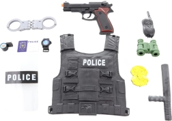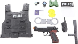 Il set include un gilet, una pistola a batterie, manette, binocolo e altri accessori per un gioco realistico da poliziotto.