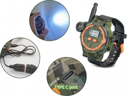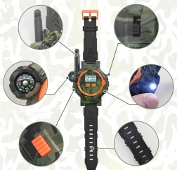 Questo orologio multifunzionale in stile militare permette ai bambini di comunicare su una distanza fino a 200 metri grazie al walkie-talkie integrato. Perfetto complemento per giochi all'aperto con amici, l'orologio si distingue per una lavorazione in plastica-gomma di qualità con cinturino camuffato nero.