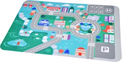 Il tappetino raffigura un paesaggio urbano con strade e parcheggi segnati, invitando i bambini a giocare a giochi educativi con veicoli.