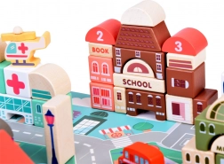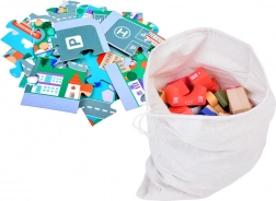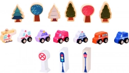 Il set include anche un tappetino da gioco con tema cittadino, che serve da base per scenari di gioco. Il tappetino ha strade segnate dove i bambini posizionano veicoli come taxi, ambulanze o camion dei pompieri, familiarizzando con le situazioni e i segnali del traffico.