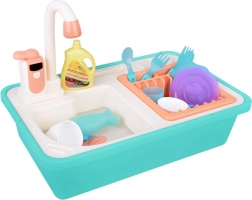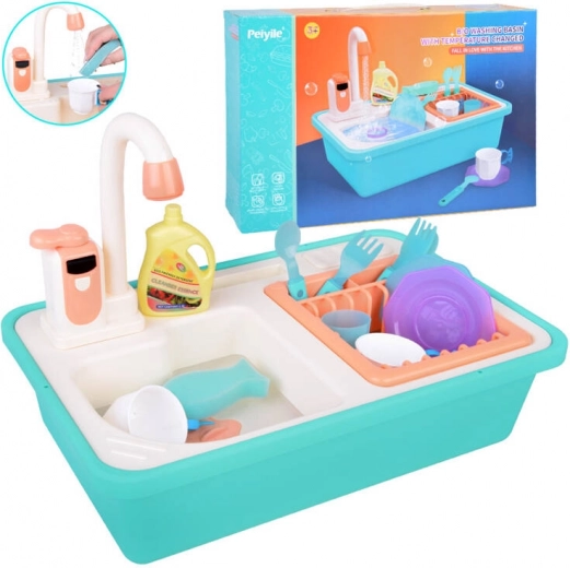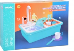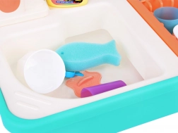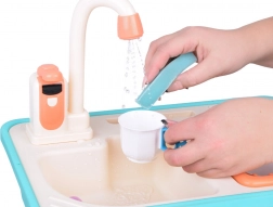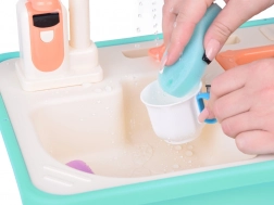 Caratteristiche: Basta riempire il serbatoio con 2,2 litri d'acqua, girare il rubinetto e osservare l'acqua circolare. Il lavandino può essere tappato con il tappo incluso, insegnando ai bambini a risparmiare acqua e a proteggere l'ambiente. Il rubinetto è alimentato da 2 batterie AA (non incluse).