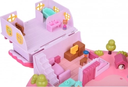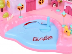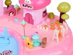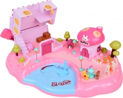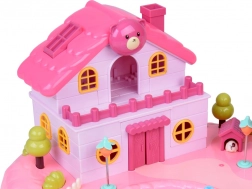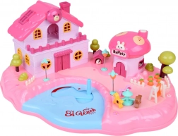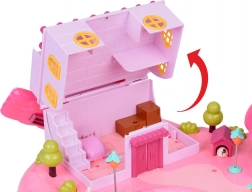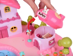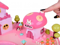La casetta offre un interno su più livelli con scenari per il gioco quotidiano: accogliente camera da letto con letto, armadio apribile, bagno con vasca e lavabo, cucinetta con frigorifero e tavolino da toeletta. Gli effetti luminosi e sonori attivati dai pulsanti amplificano l’atmosfera di gioco e l’insegna retroilluminata RABBIT segue il ritmo della melodia.